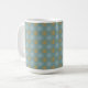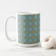 This mug features a tiled pattern in soft blue and gold by artist Jayne Wilson.
