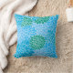 Shades of blue and green dahlia motif adorn this beautiful throw pillow.