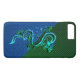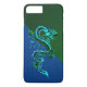 Colorful fantasy themed iPhone 7 Plus case done in a green on green gradient pattern, on the upper part of the case and a gradient blue pattern, on the lower part. Graphics artwork of a blue and green Chinese style dragon, decorates the middle of the case. Customize to add any text you want to this unique case.