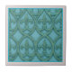 photography closeup of metallic pattern of fluer-de-lis in blues and greens.