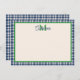This monogrammed note card features a blue and cream gingham plaid tartan with an accent of green. Personalize the matching blue and green monogram with your choice of name and initial.