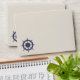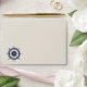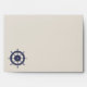 Nautical themed wedding invitation envelope done in a vintage ivory, with blue vintage illustration of a ship's steering wheel decorating the front. The inside of the envelope is done in a solid blue. Return address, in blue, is fully customizable and ready to personalize for your big day. Lovely finishing touch to our blue and ivory Nautical themed wedding invitations.