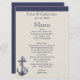 Nautical themed wedding menus done in ivory, with navy blue accents and vintage artwork of a ship's anchor, on the left side. Personalize the blue text for your wedding celebration. Matching products are available.