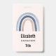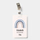 Name tag with a cute and whimsical rainbow. Blue and peach watercolors.