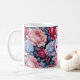 This mug features roses and peonies in soft sky blue, delicate shell pink, and dark wine red, with teal and purple foliage in the background. Beautiful and luxurious with a vintage country look that’s still very modern. A round badge in complementary pink shades holds your name and monogram.