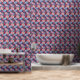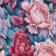 This wallpaper features roses and peonies in soft sky blue, delicate shell pink, and dark wine red, with teal and purple foliage in the background. Beautiful and luxurious with a vintage country look that’s still very modern.