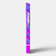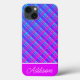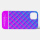 This iPhone case features a blue and purple gradient plaid pattern with a thick purple stripe and thin white stripe with a customizable name.