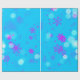 Bright blue background with purple snowflakes and bright bokeh lights to mimic snow or Christmas lights.
