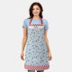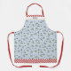 This Blue and Red Grasshopper and Ladybug Insects Apron features a hand-drawn pattern of whimsical green grasshoppers jumping this way and that leaving little polka dot trails and little cute ladybugs scattered about, all against a light blue background. Red and white checkered top and bottom border with matching red straps. Customize with your name.