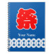 Plan your next festival with this notebook designed like a Japanese happi coat! The blue cover prominently features the kanji for "festival" (matsuri) in red, with a white outline. At the bottom is a traditional white chain pattern found on some happi coats. There is a place for you to add your name or notebook subject as well!