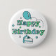 Cute hand drawn blue and green Happy Birthday button with balloon and birthday cake.