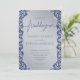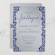 This wedding invitation presents a refined combination of deep blue tones paired with shimmering silver detailing. The intricate silver damask frame enhances the design’s sophistication, while the soft central panel elegantly highlights the couple’s names. The contrast between cool blue and metallic silver creates a modern yet timeless aesthetic, perfect for evening weddings, winter celebrations, or any event seeking a touch of luxury and grace.