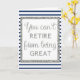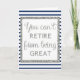 A blue and silver retirement card. The front says you can't retirement from being great, which is trimmed with a beautiful silver glitter design in front of a blue and white striped background. The inside reads a retirement sentiment, but you can easily personalize. The back says happy retirement in silver glitter against a blue and white striped design. This would make a great keepsake for the retiree.