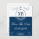 Navy blue and silver Save The Date postcards with rhinestone and calligraphic decor. Personalize these postcards on both sides. Delete the texts you don't need.