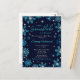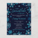 This elegant and glamorous invitation postcard features watercolor turquoise blue and silver faux glitter snowflakes and sparkles on a navy blue background. It is perfect for a winter or Christmas themed baby shower.