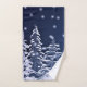 Decorate your holiday bathroom with a winter wonderland color scheme. This blue and silver towel set features a midnight sky, snow-covered trees and snow on the ground. Use this towel set at Christmas and beyond. Personalize the text with your own words.