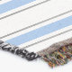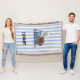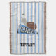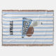 Cheerleader's fringed throw blanket done in a blue, light gray, and white striped pattern. Graphics of a football and two megaphones, decorate the middle of the blanket. Personalize the bold black text to suit your needs. Great for keeping warm, on the bleachers, and as a throw for your bed.