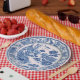 This plate design features a large blue and white chinoiserie gazebo on a blush pink background.