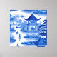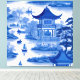 Blue and white traditional style chinoiserie landscape with pagodas and rice boats