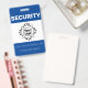 This custom security guard employee identification badge features a sample logo in the center. The title "SECURITY" is printed above it in bold white font over a blue background. You can include your company, business or organization name or additional text below the logo, as well as an employee name. The back of the badge features additional employee or company information printed over a blue background, with a sample barcode placed at the bottom. You can replace the scan code with your own, or another image.