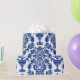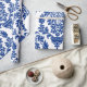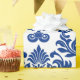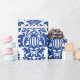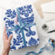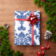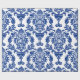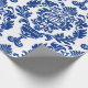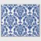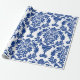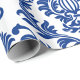 Blue and white damask patterned paper shown both unrolled and flat. The elegant floral motifs convey a classic and decorative style.