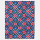 blue rounded diamonds with a small white diamond in the middle. black surrounds the blue. white thin lines with blue in the middle and red round circles create an x like pattern around the blue diamonds.