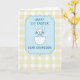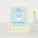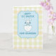 This card features a soft pastel illustration centered on a light blue decorative frame with a dashed stitch-style outline, giving the scene a gentle, cozy look 🌷. Inside the frame, the message “HAPPY 1ST EASTER DEAR GRANDSON!” appears in uppercase lettering, set neatly in the middle in a darker blue for easy reading. Below the text, a simple white line-drawn bunny with round ears and a tiny bow tie looks sweetly forward, like it’s posing for a family photo 🐰. The bunny rises from a cracked eggshell, suggesting a new little chapter, with the shell dotted in light blue spots. The shapes are smooth and minimal, and the soft colors keep the mood affectionate and close, like a warm hug from family. Behind everything, the background is a soft yellow-and-white gingham pattern that feels like a picnic cloth laid out for springtime. The blue frame and bunny sit centered against the checked backdrop, with the pale yellow squares evenly repeating across the entire card.