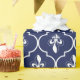 This decorative wrapping paper with a French flair features a bi-directional pattern of modern white fleur-de-lis symbols inside of a quatrefoil design on a dark blue background. The background color can be changed to any other color you prefer.
