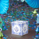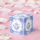 This bridal shower tea party favor box has a monochromatic design featuring a blue and white chinoiserie teapot with ornate corners.