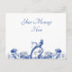 These postcards are ready to be customized with your own message on the front and are illustrated in the style of classic blue and white china dishes with a floral motif with bird accent. There's plenty of room on the reverse side for adding a longer message.