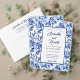 A wedding tray with a blue and white floral toile design and space for the bride and groom's name and wedding date.