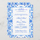 Imagine opening an envelope to reveal a stunning display of intricate design. The invitation is adorned with a mesmerizing Moroccan-inspired pattern, carefully crafted in serene shades of blue and crisp white. Each element of the design, from the geometric motifs to the delicate floral accents, tells a story of heritage and sophistication.