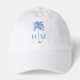 This coastal inspired baseball cap features a classic preppy palm palmetto tree in blue on a white background with a monogram that you can personalize with your choice of initials.
