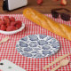 Summer beach house themed paper plates with clam, scallop and seashells in blue and white for coastal, nautical decor.
