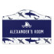Add a touch of the ocean to the bedroom or nursery door of your little boy with this custom blue and white shark pattern room sign. Sign has cute sharks swimming in the sea and your little one's first name.