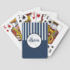 Simple, classic, and stylish, this card deck features vertical, navy blue and white stripes, with a wide, blue color block at the bottom. A round badge holds your name and monogram. Great stocking stuffer!