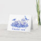 This thank you card has a monochromatic design featuring a blue and white tea set surrounded by birds and flowers.