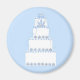 An elegant four tier wedding cake in white with soft blue accents. A pretty shade of blue for the background.