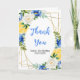 This beautiful and elegant thank you card features watercolor blue, yellow and white flowers with foliage on a gold geometric frame. The text combines handwritten script and serif fonts for a stylish and modern look. This is perfect for a spring or summer rustic birthday party.