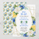 This beautiful and elegant save the date invitation features watercolor blue, yellow and white flowers with foliage on a gold geometric frame. The text combines handwritten script and serif fonts for a stylish and modern look. This is perfect for a spring or summer rustic wedding.