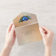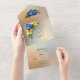 Elegant wedding tri-fold all in one invitation done in a gold tone color. A framed area for custom text is edged with lovely graphics of blue and yellow iris flowers. Matching wedding products are available.