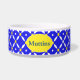 White ceramic dog food / water bowl, with a yellow, blue, and white stylized quatrefoil pattern, around the outside. A yellow text oval, on the front of the dish, has blue custom text ready to personalize. Matching pet products are available.