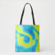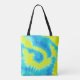 This tote bag showcases a blend of vibrant blue and sunny yellow hues in a tie dye pattern. It offers ample space to carry your essentials, from books and groceries to a day at the beach.