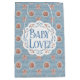 Send a sweet message with this beautiful vintage style design. Antique lettering on a faded blue background sets the stage for this pink rose bouquet on an old fashioned lace doily. Pink and white toile bows complete the pattern. Personalize the text with the message of your choice.