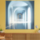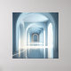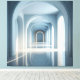 Ein lichtdurchfluteter Korridor mit wiederholten Rundbögen, sanften Blautönen und einem leuchtenden Lichtstreifen, der den Blick in die Tiefe führt. Die klare Symmetrie und die reflektierenden Flächen erzeugen eine ruhige, futuristische Architekturwirkung.