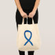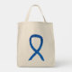 Tote bag features blue awareness ribbon art. The blue awareness ribbon color means support for ALS, Free Speech, Foster Care Awareness, Colon Cancer, Child Abuse Awareness, Drunk Driving Awareness, Education, Arthritis, Huntington's Disease, Human Trafficking, Stop Bullying, and Save the Music to name a few. Let the blue awareness ribbon help support awareness for these causes!