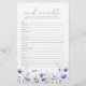 Make your baby shower bloom with fun with the Blue Baby In Bloom Wildflower Word Scramble Game. This floral-themed word scramble features baby words or items to unscramble. It's perfect for bringing some cute, blue floral fun to the baby shower! The beautiful wildflower designs create a whimsical baby shower theme that the mom-to-be is sure to love. It's an adorable game that entertains and delights! If you're looking for a cute, one-of-a-kind baby shower game that fits with a floral baby in bloom theme, the Blue Baby In Bloom Wildflower Word Scramble is a perfect choice. The beautiful wildflowers and fun word scramble will make mom's day extra special.