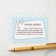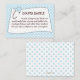 A fun game for you to include in the baby shower invitation that welcomes guests to be entered into a raffle, if they bring a package of diapers along with them to the baby shower. A cute little blue diaper pin holds a white banner in this design of pastel baby blue and white - a color scheme and design that will coordinate with just about any baby boy shower invitation too.