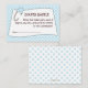 A fun game for you to include in the baby shower invitation that welcomes guests to be entered into a raffle, if they bring a package of diapers along with them to the baby shower. A cute little blue diaper pin holds a white banner in this design of pastel baby blue and white - a color scheme and design that will coordinate with just about any baby boy shower invitation too.