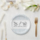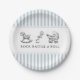 Creative baby shower plates featuring silver charms, blue stripes and funny original quote on blue background for mother-to-be.